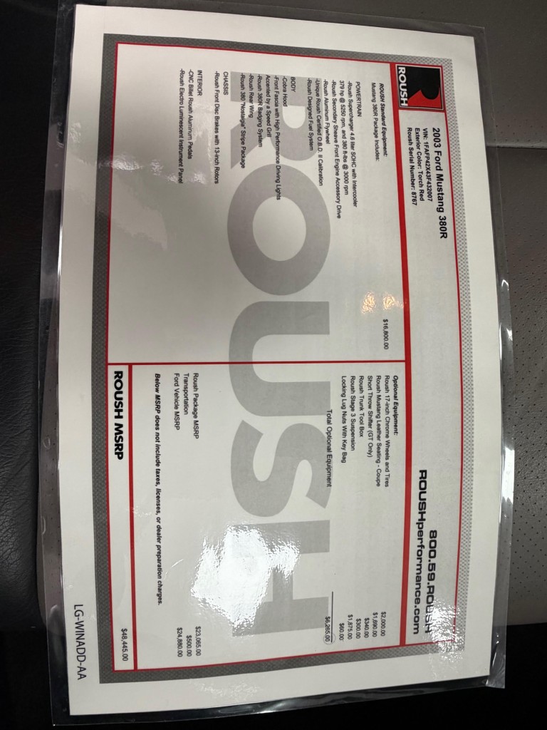 Extreme Motorcars is pleased to present this spotless 2003 Ford Mustang Roush Edition. This car is in pristine condition inside and out, has been garage kept its whole life and has only 25K original miles. Interior & exterior are practically spotless and have no wear or damage. This is a one-of-a-kind collector's car. To find one in this condition with this low of miles is virtually impossible. Build sheet from Roush is attached in the pics. Car has been meticulously maintained. Also has been signed by Jack Roush himself!!!